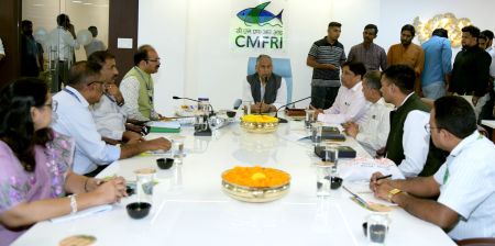 डॉ. ग्रिंसन जॉर्ज, निदेशक, भाकृअनुप-सीएमएफआरआई, ने उन्हें संस्थान की मुख्य गतिविधियों, चल रहे रिसर्च कार्यक्रमों और तकनीकी नवाचारों के बारे में बताया।